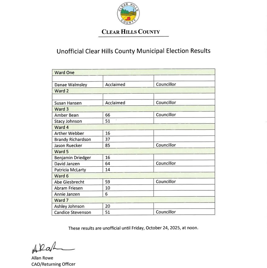 Unofficial 2025 Clear Hills County Municipal Election Results